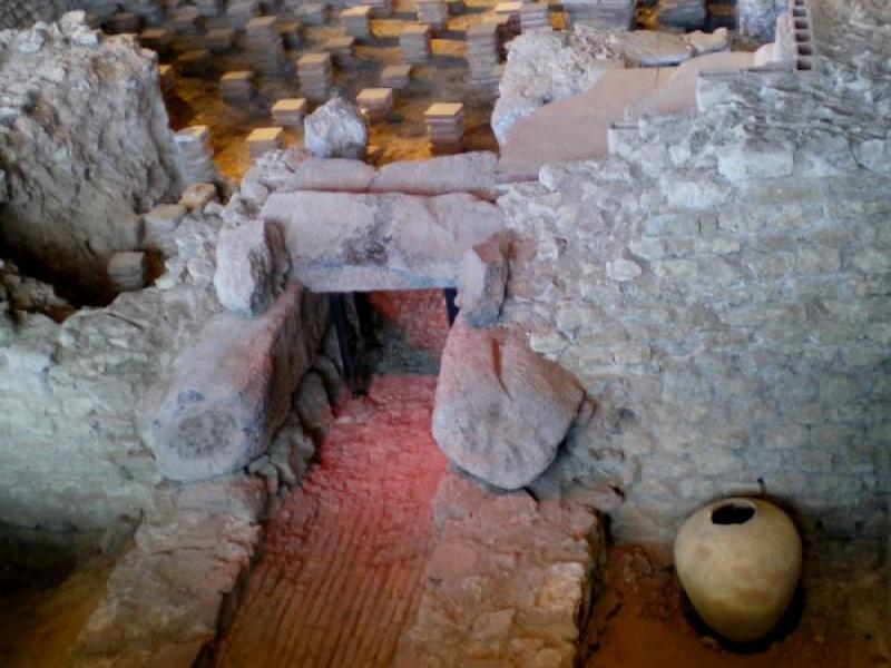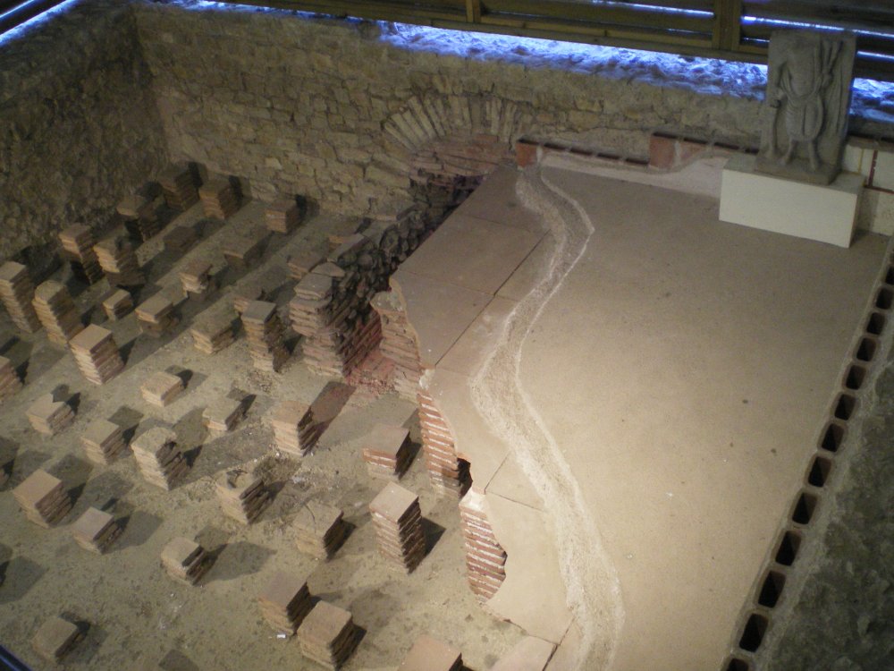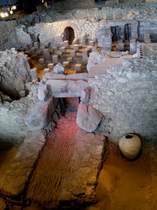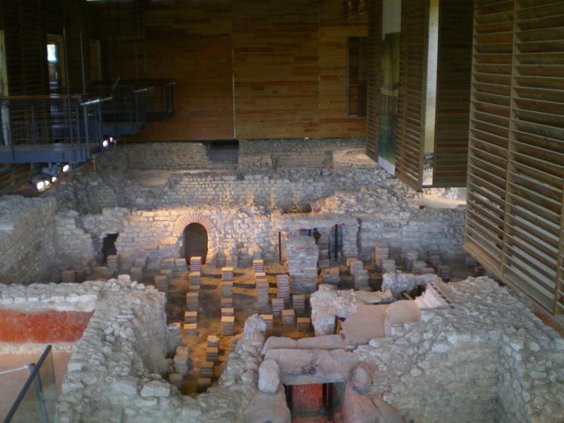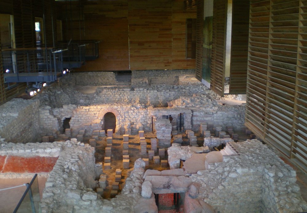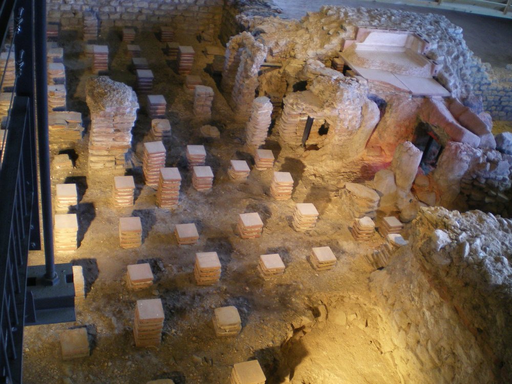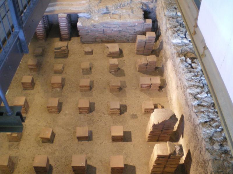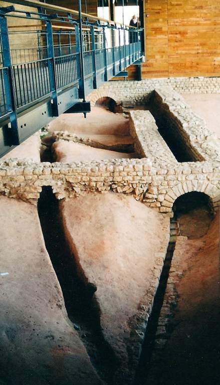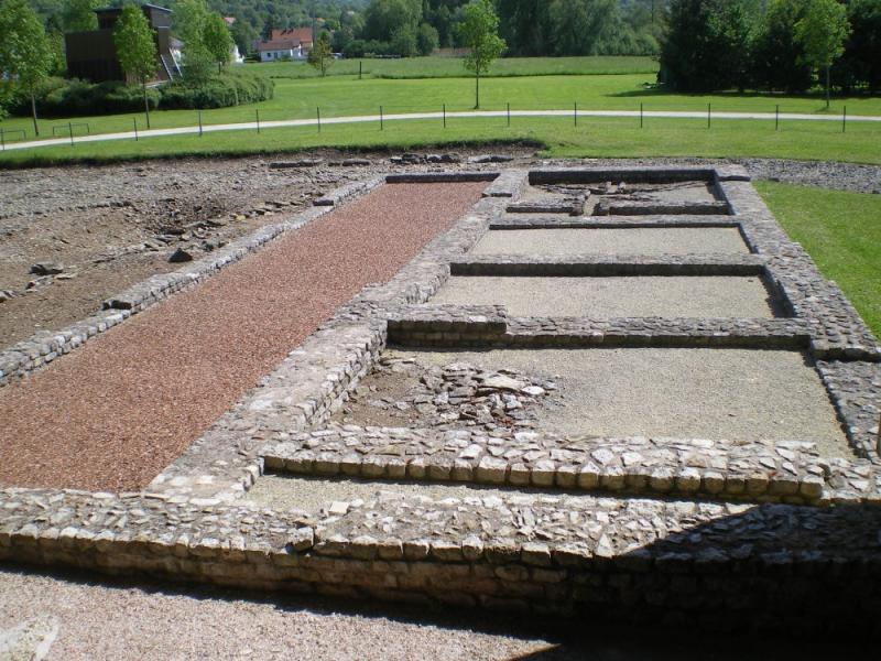 • 16. Une partie fut ensuite remise en état et, au IVe s., un atelier de bronzier et des boutiques s'y installent. Bien plus tard, au Moyen Âge, on récupéra des matériaux des ruines pour aménager une ferme fortifiée que les textes mentionnent sous le nom de Burch (Château).