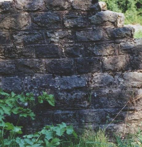 - 6. Au dessus, un arc plus large est composé de larges claveaux de tuf calcaire ; son extrados est souligné par un bandeau de pierres plates alternant avec des fragments de tuiles ; des assises de briques remplissent l'espace entre les deux arcs.