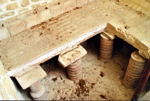 La chaleur était bien plus élevée dans la petite salle carrée du caldarium (3d). Tépidarium et caldarium sont chauffés par hypocauste. L'ensemble est fort bien conservé, avec ses piles de plaques rondes ou carrées soutenant les dalles de la suspensura.