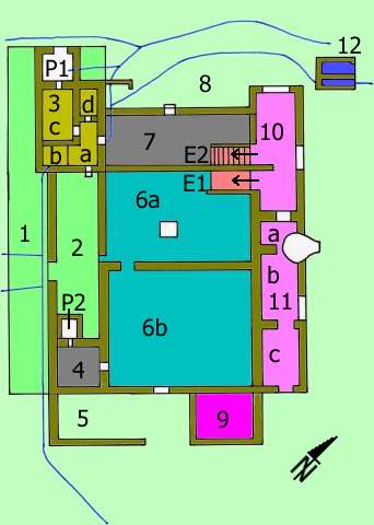 On remarquera en particulier les tubuli, qui évacuaient gaz et fumées par les murs tout en les chauffant. Le praefurnium (P1), où l'on faisait le feu, est à l'extérieur et forme une excroissance sur le côté nord du plan.De la galerie 2, on passe au second niveau, où se trouve la véritable zone d'habitat. On pénètre dans un grand ensemble subdivisé en trois. En réalité, seules 6a et 6b sont tributaires de la galerie 24. La grande pièce 6a avait un foyer central en dalles de terre cuite ; un escalier de bois (E1) permetait de gagner le niveau inférieur du bâtiment. De 6a on passe en 6b, plus vaste encore, qui a une entrée sur la façade sud et commande la pièce 4.
